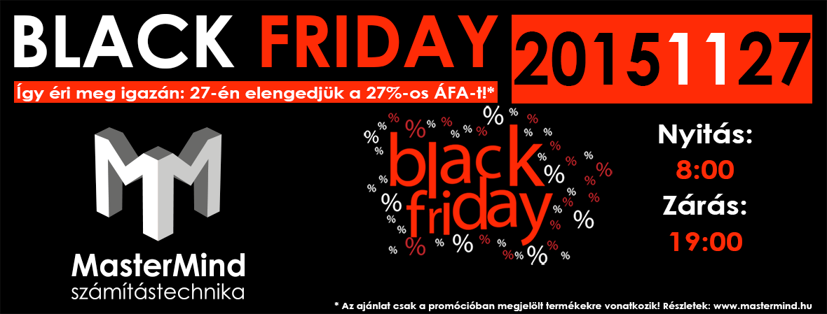 *2015. november 27-én a MasterMind Számítástechnika Black Friday 2015 elnevezésű akciót hirdet. Az akció időtartama 2015. november 27. 8:00-tól 2015. november 27. 19:00-ig tart. A termékek készlete korlátozott, ezek forgalmazása kizárólag a készlet erejéig történik. Az akcióban egy vásárló egy termékből csak egy darabot vásárolhat az akciós áron, további darabok vásárlása a listaáron történik. Fenntartjuk a jogot, hogy lemondjuk azokat a rendeléseket, amelyek nem tesznek eleget ennek a szabálynak. Az akció csak az aznap átvett és kifizetett termékekre vonatkozik, előrendelés nem adható le a termékekre.